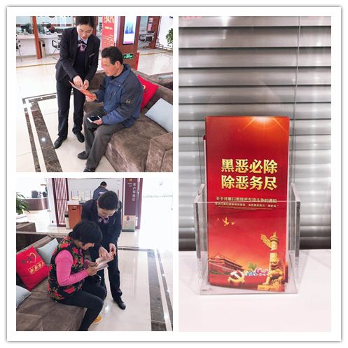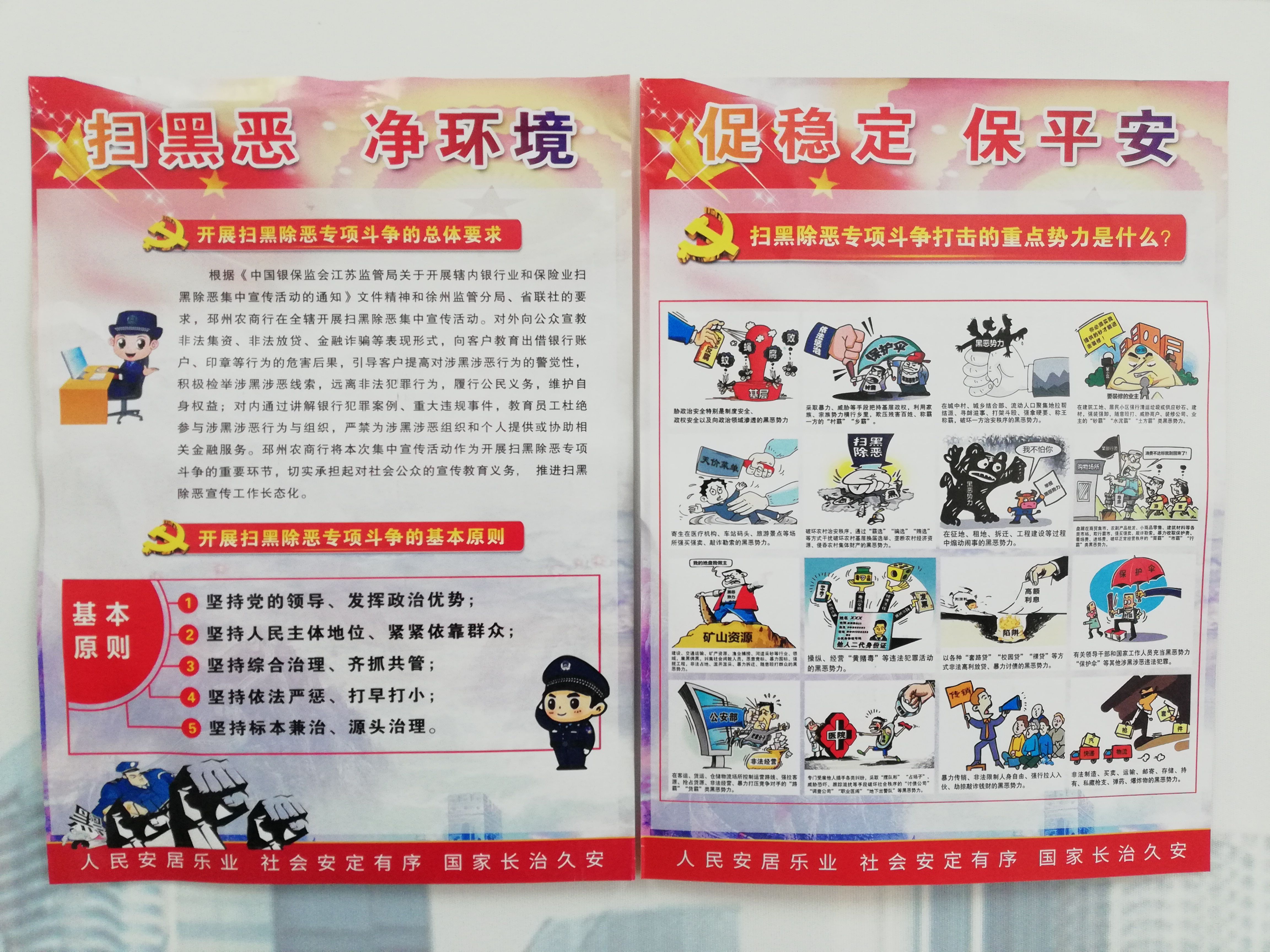為認(rèn)真貫徹落實(shí)《中國(guó)銀保監(jiān)會(huì)關(guān)于銀行業(yè)和保險(xiǎn)業(yè)做好掃黑除惡專項(xiàng)斗爭(zhēng)有關(guān)工作的通知》(銀保監(jiān)發(fā)〔2018〕45號(hào))、《中國(guó)銀保監(jiān)會(huì)江蘇監(jiān)管局關(guān)于開(kāi)展轄內(nèi)銀行業(yè)和保險(xiǎn)業(yè)掃黑除惡集中宣傳活動(dòng)的通知》(蘇銀保監(jiān)發(fā)〔2019〕58號(hào))文件精神,根據(jù)徐州監(jiān)管分局和省聯(lián)社的工作要求,邳州農(nóng)商銀行持續(xù)開(kāi)展掃黑除惡專項(xiàng)排查及宣傳活動(dòng)。